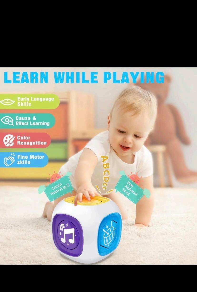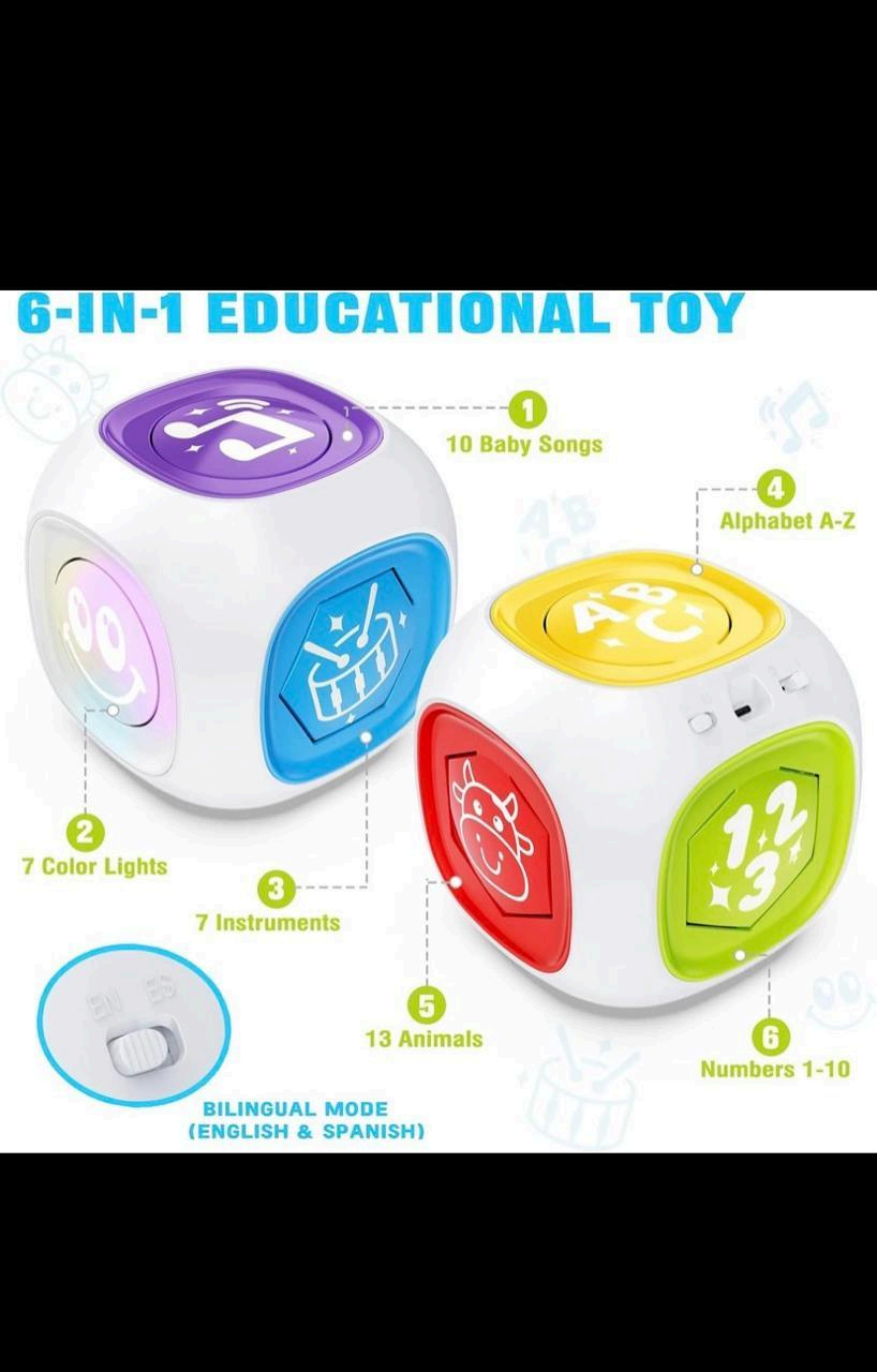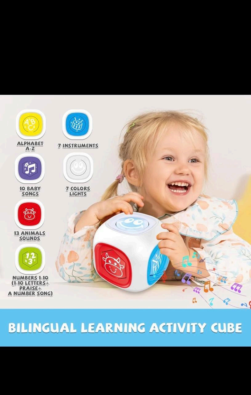 An interactive learning cube that teaches numbers, letters, animals, and music. Features of the product include: