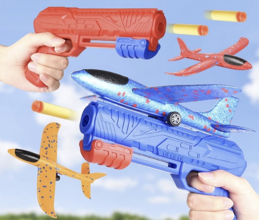 Description: This product is a toy airplane launcher set designed for outdoor fun for kids. It typically includes a blue launcher gun and multiple red foam glider planes. Key features: Material: The planes are made from eco-friendly EPP foam, making them lightweight, impact-resistant, and flexible. Flight Modes: The planes feature two flight modes (horizontal glide and rotate/gyrant) which are determined by inserting the plane's tail into different slots. LED Lights: The planes come with colorful LED flash lights, allowing for enjoyment even at night. Launch Mechanism: A catapult launcher propels the planes, with an optimal launch angle of 45°-60° recommended for flights of up to 10-15 meters (32.8-49.2 feet).