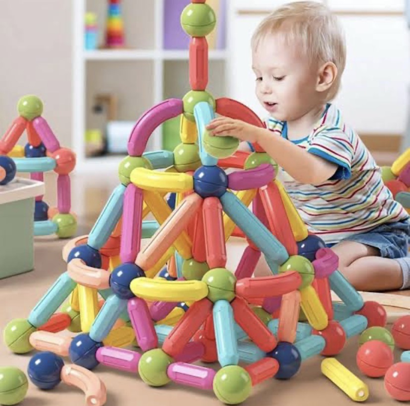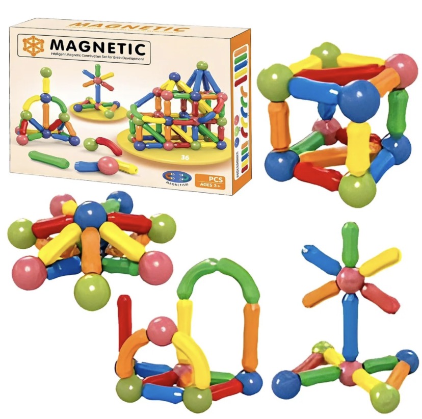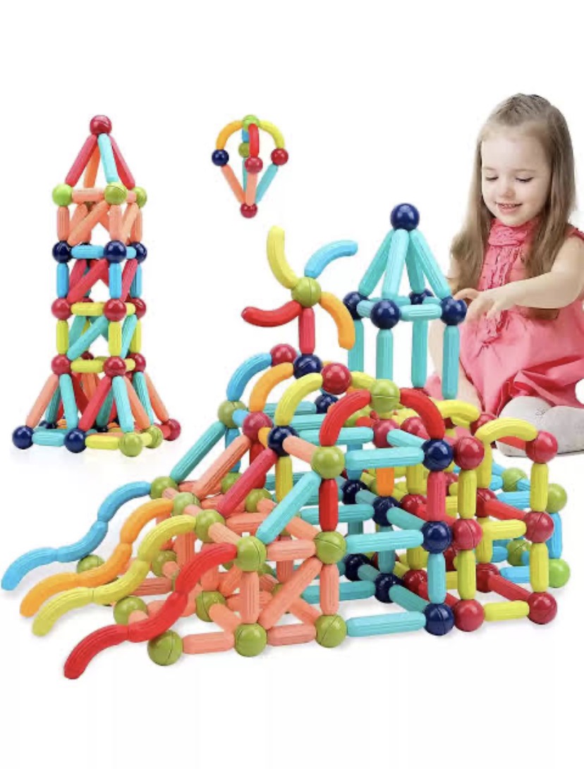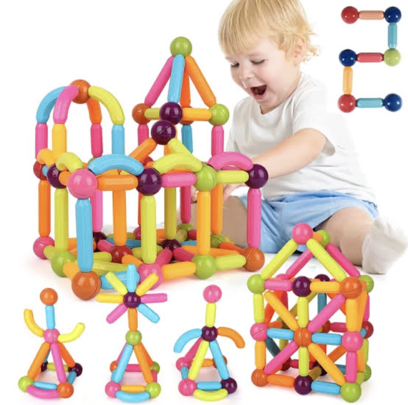 - Description: A magnetic building block set that lets kids create 2D and 3D shapes, encouraging creativity and critical thinking through hands-on play. Features of the product include: Educational Focus: Designed to promote STEM learning (Science, Technology, Engineering, and Mathematics), enhance thinking skills, and develop hand-eye coordination and color recognition. Design: The sets typically include a variety of colorful curved and straight magnetic sticks in different lengths, along with non-magnetic metal balls that act as connection points. Material: Made from high-quality, durable materials such as ABS plastic and permanent magnets. They are often BPA-free and feature smooth, round edges for safety. Ease of Use: Strong magnets allow for easy and quick construction, making it an engaging activity for kids aged 3 and above