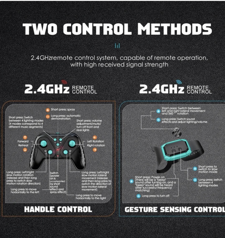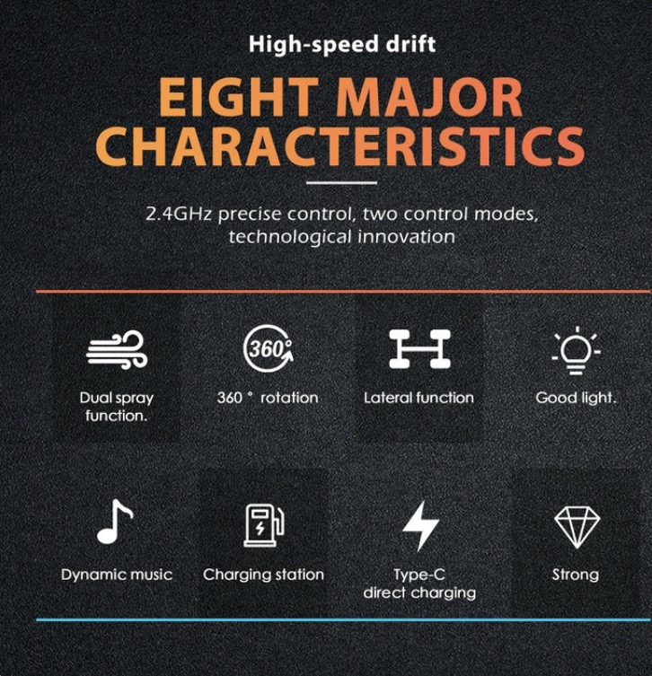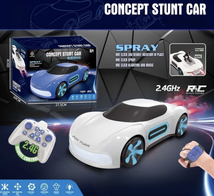 Description: The RC car is a futuristic concept vehicle with a pearl car shell and multi-directional driving capabilities. Key features  Spray Function: The car has a spray function that mimics exhaust mist effects.  Cool Lighting: It features cool lighting, including light effects on the wheels and chassis.  Full Range Driving: The vehicle offers full-range controls, allowing for movements like forward, backward, left turn, right turn, lateral drift, and 360° rotation.  Control Technology: It utilizes 2.4GHz technology for precise and long-distance remote control.  Included Accessories The package includes all necessary items to operate the car: Control Options: Both a remote control handle and a remote controlled watch are provided. Power: A 3.7V battery and a USB charging cable are included. Customization: Stickers and a water bottle (likely for the spray function) are part of the set. Tool: A small screwdriver is included for assembly or battery access.