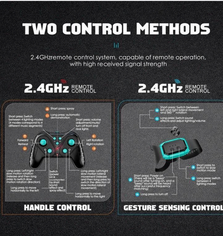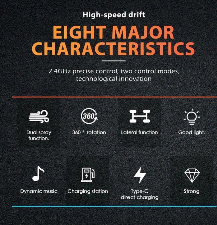 A futuristic RC car with cool lighting and water spray effects. Features of the product include: